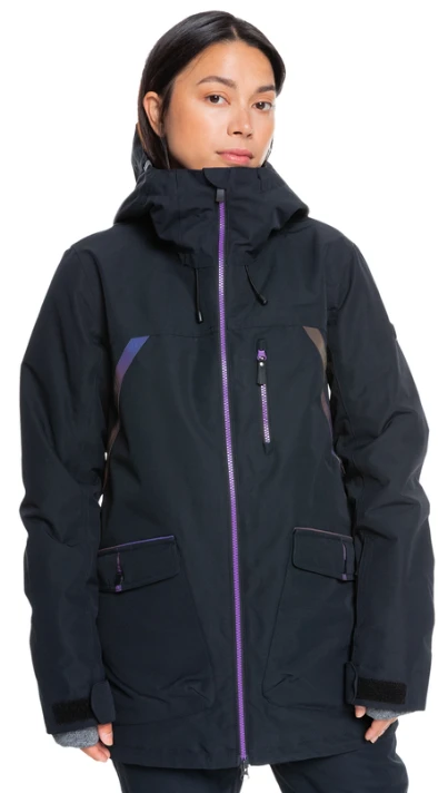 Snow Jacket for Women. Features include: 15K ROXY DryFlightยฎ technology for serious waterproofing [15,000 mm/10,000g], Insulation: PrimaLoftยฎ Black with 60% post-consumer recycled material for warmth, softness and lightweight comfort [fill weight: 40g], Lining: Lightweight polyester taffeta with brushed tricot, Fit: Tailored extra long fit, Fully taped seams, 3-way adjustable fixed hood, Removable taffeta powder skirt, Tuck away powder skirt system with snap fastener, Jacket-to-pant attachment system, YKKยฎ Aquaguardยฎ zip, Chest pocket, Hand-warmer pockets, Sleeve pass pocket, Mesh lined underarm vents, Internal stretch wrist gaiters with finger warming tuck away system, Chin guard, ROXY HydroSmart technology integrated in the collar, ROXY HydroSmart technology: Fabric is enriched with an all-organic formula that protects, calms and cares for skin in harsh conditions, Integrated ROXY Warmlinkยฎ back heating panel pairing perfectly with the Belkinโข Power Bank (not included) or any other power bank you may already own, we recommend one with 10,000mAh for a full day of warmth, Key clip, Lens cleaner.